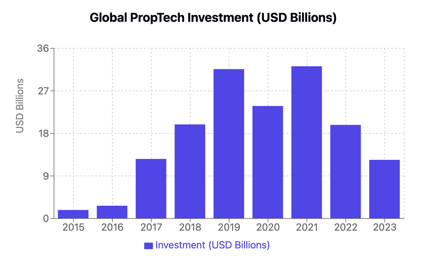 El sector proptech estaba todavía en su infancia, con inversiones globales que oscilaban entre $1.8 mil millones en 2015 y $2.7 mil millones en 2016. Este período se caracterizó por inversiones en etapas tempranas, principalmente en plataformas de listados de propiedades (marketplaces) y software básico de gestión inmobiliaria (property management).